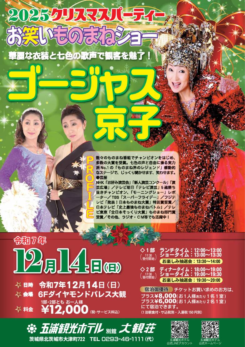華麗な衣装と七色の歌声で人気のゴージャス京子さんによる お笑いものまねショーを開催いたします。